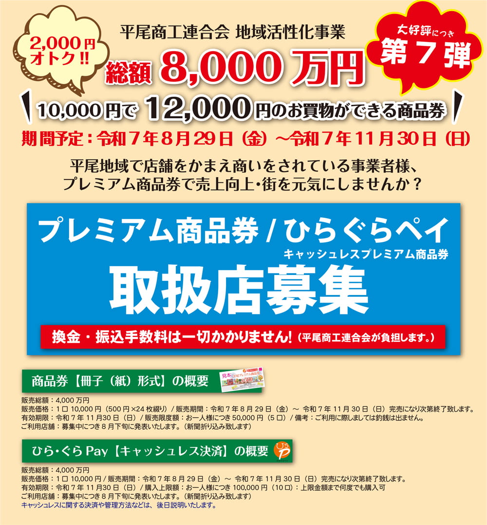 ただ今、「ひらぐらペイ」「平尾プレミアム商品券」の取扱店を募集しています。